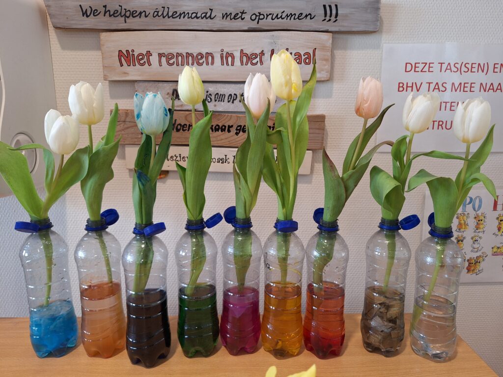 Wat gebeurt er met witte tulpen als ze in gekleurd water staan?