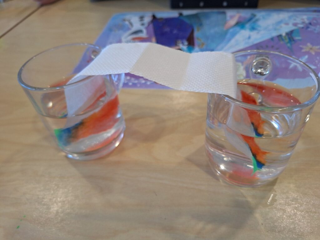 We hebben een proefje gedaan met water en keukenpapier.