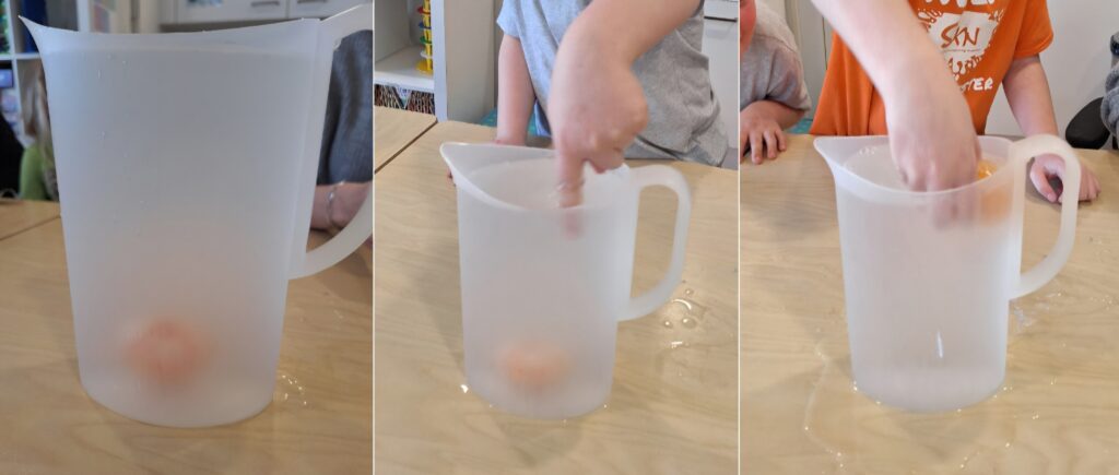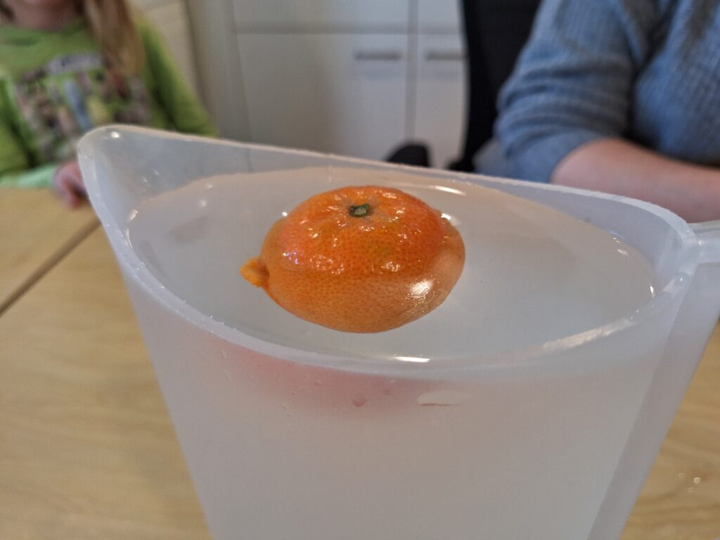 En dan de mandarijn. Is er verschil in drijven/ zinken als je een mandarijn met of zonder schil in het water legt?